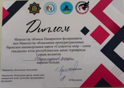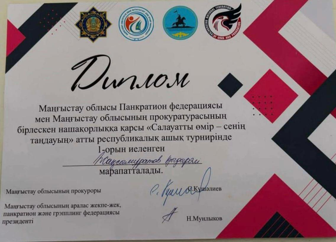 Колледжіміздің ЭЛог — 9/25-02 тобында оқитын студентіміз Жақсымұратов Қыдырәлі Маңғыстау облысы Панкратион федерациясы мен Маңғыстау облысының прокуратурасының бірлескен нашақорлыққа қарсы “Салауатты өмір — сенің таңдауың” атты республикалық ашық турнирінен 1 — орын иеленді.